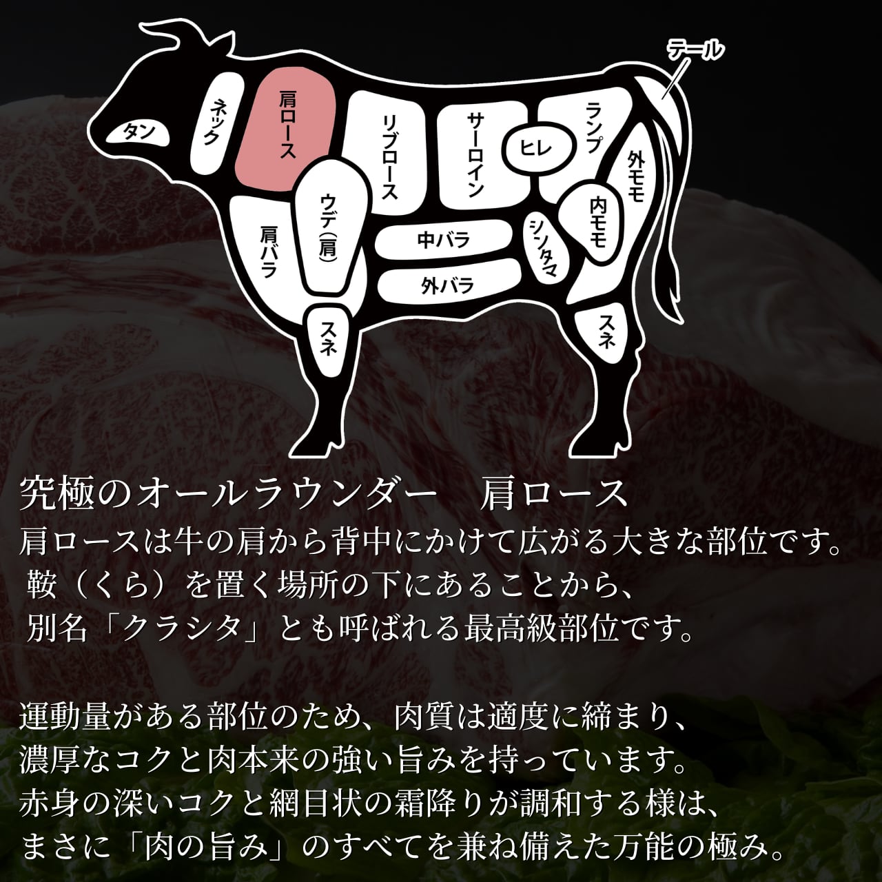 牛の背中側に位置する「肩ロース」は、赤身と霜降りのバランスが最も美しいとされる部位。4等級ならではの質の高さを存分に感じていただけます。