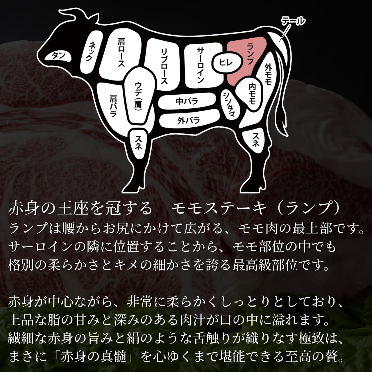 赤身肉の王道ともいえる「モモ」は、黒毛和牛ならではの芳醇な風味を最もダイレクトに味わえる部位です。