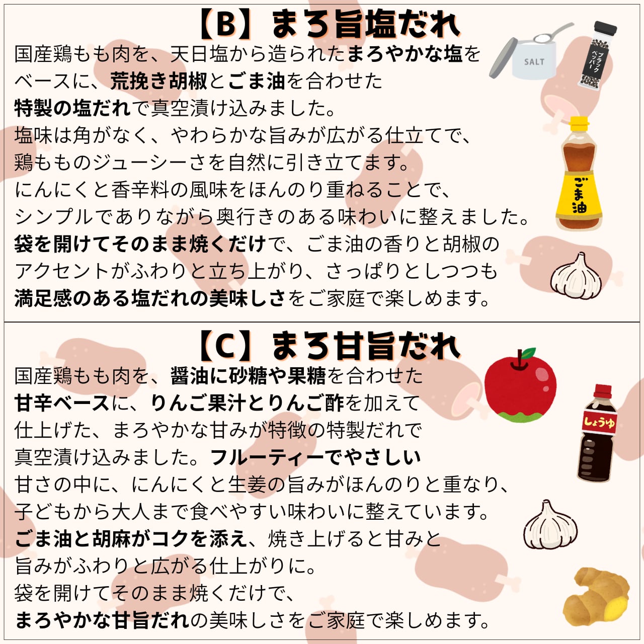 【B】まろ旨塩だれ 200g:天日塩とごま油の香りが引き立つ、さっぱり上品な味わい。