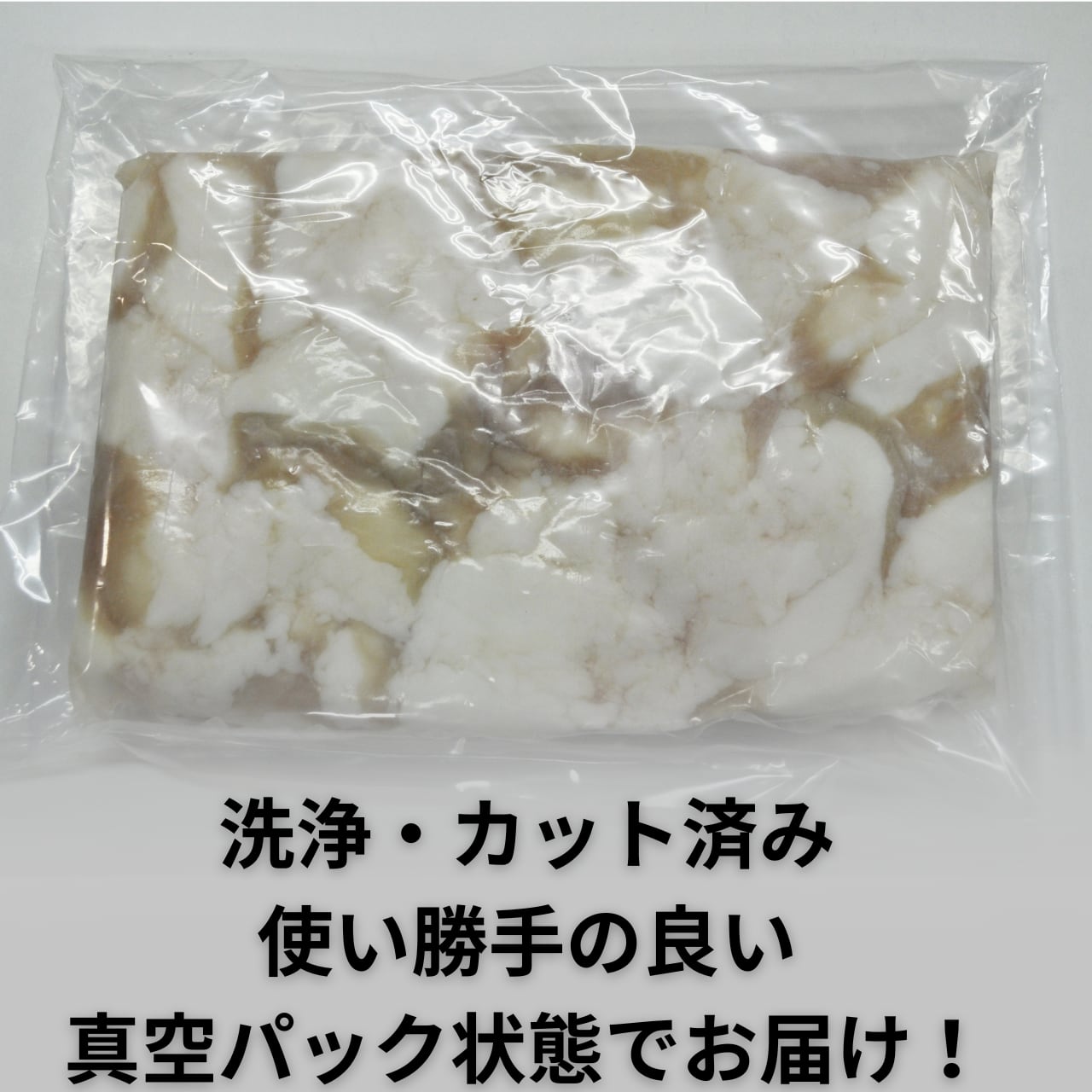丁寧に洗浄し、最適なサイズにカット済み。真空パック(500g×2)でお届けするので、ご家庭で手間なくすぐにお使いいただけます。